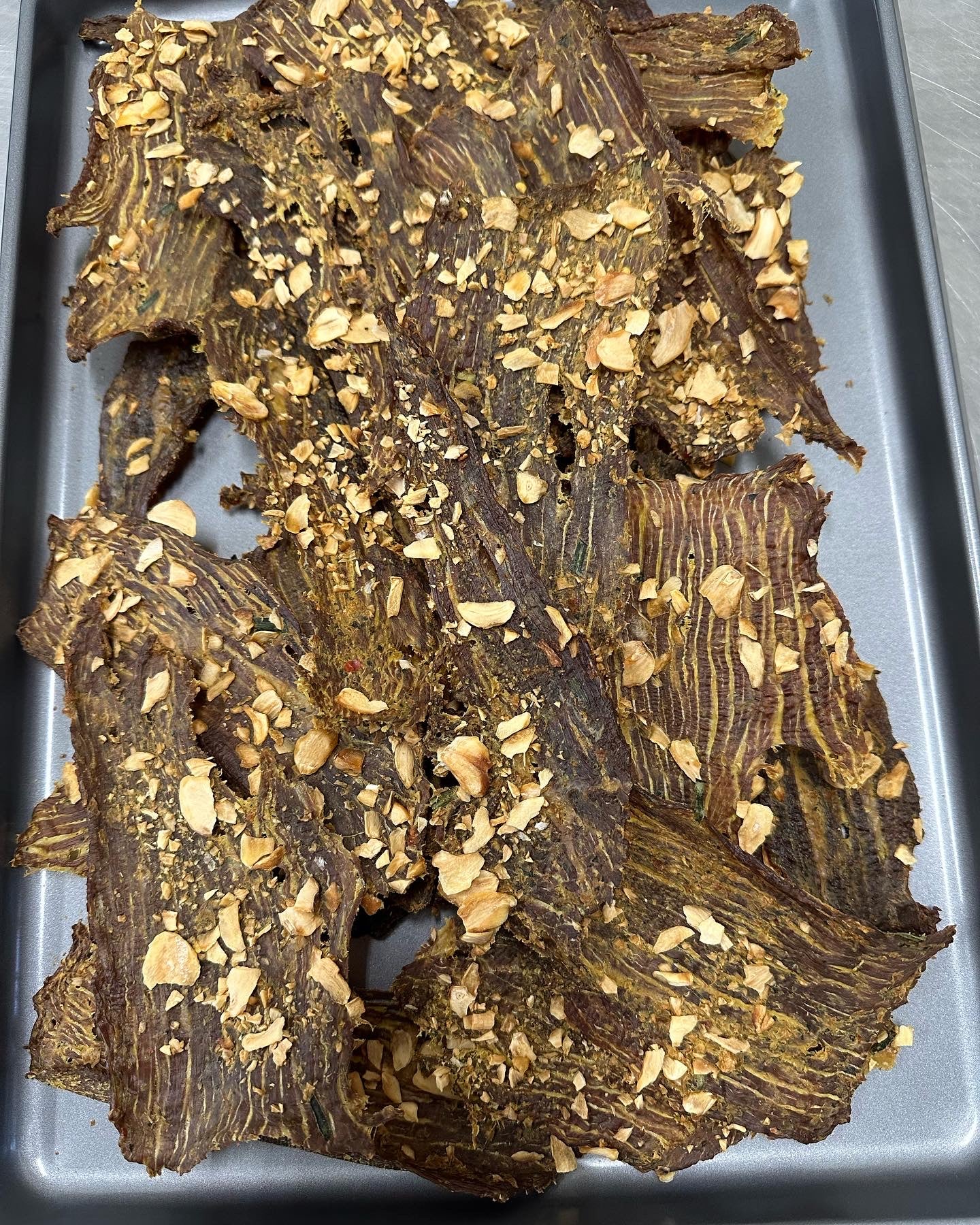 Golden hues, Dried garlic, creamy coconut, chicken stock and fish sauce have what in common? They all form the backbone of Ohn No Khao Swe. What better way to take a dish synonymous with Myanmar than on a beef jerky chip. One bite and you’ll go on an adventure. Theres some everlasting gobstopper type action here. Unfortunately, though snozzberries were unavailable. However, im sure they would very much taste like snozzberries.